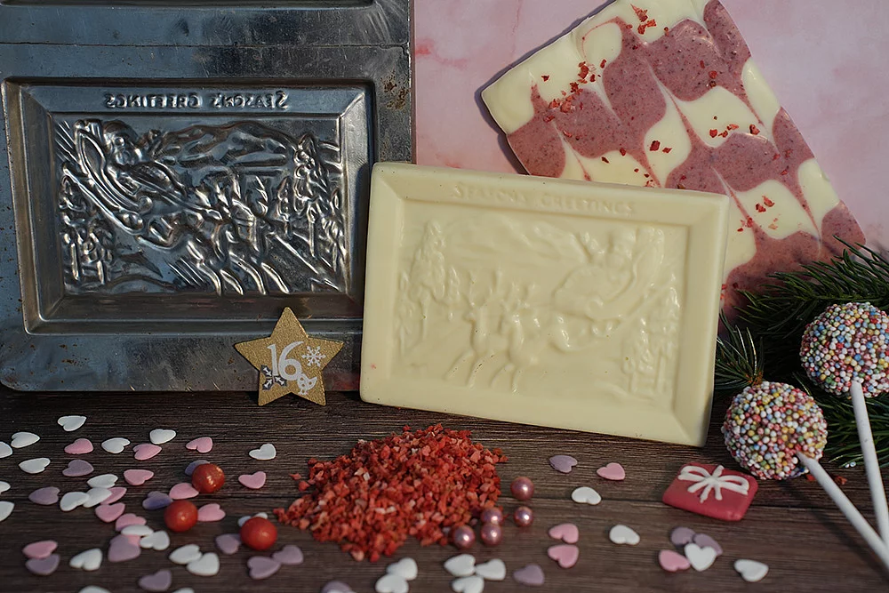- restliche gefriergetrocknete Erdbeeren auf die Tafel streuen.