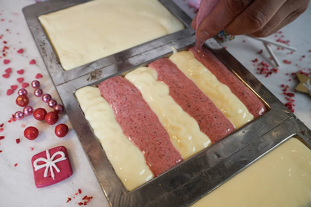- Erdbeer-Schokolade jetzt in die 4 freien Streifen gießen.