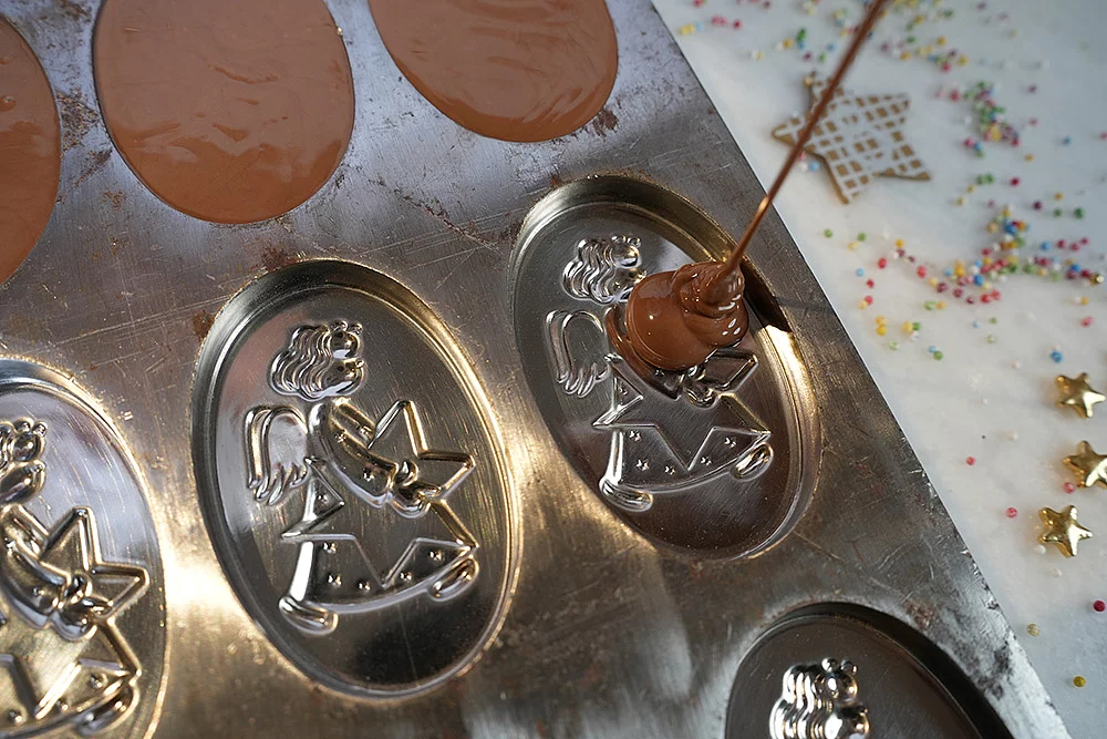 Do you also have angel figurines in your box of Christmas decorations? Angels are an integral part of the traditional Christmas story. We come across them on greetings cards, as tree decorations, in shop windows and, of course, in every nativity scene. We have taken a beautiful relief mold from the exhibition and are casting nine chocolate angels for you. We estimate the mold to be from the 1950s or 60s. Metal molds were no longer produced after 1970 as they were far too expensive.