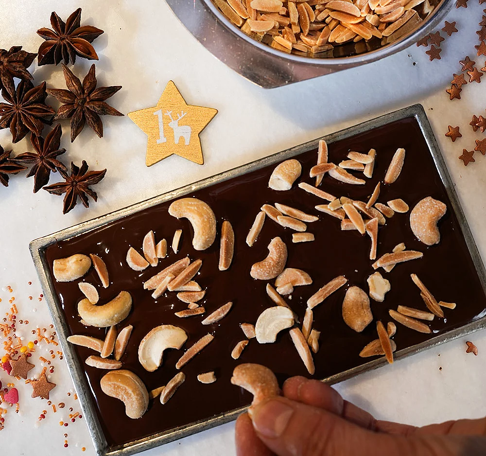 First, roughly chop the chocolate and melt it in a bain-marie over a low heat. Carefully pour the tempered chocolate into the chocolate bar mold. Tap the mold a little so that any air bubbles rise. Garnish with the cashew nuts and almond slivers before the chocolate sets. When it starts to set, chill in the fridge for approx. 30 mins. Then carefully turn the bar out of the mold.
