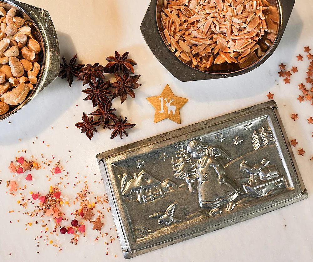 Today we are using a beautiful historical mold with an angel pulling a sleigh. The mold was made by Willi Burkhardt from Nuremberg, a well-known German manufacturer of metal molds for the confectionery industry in the first half of the 20th century.